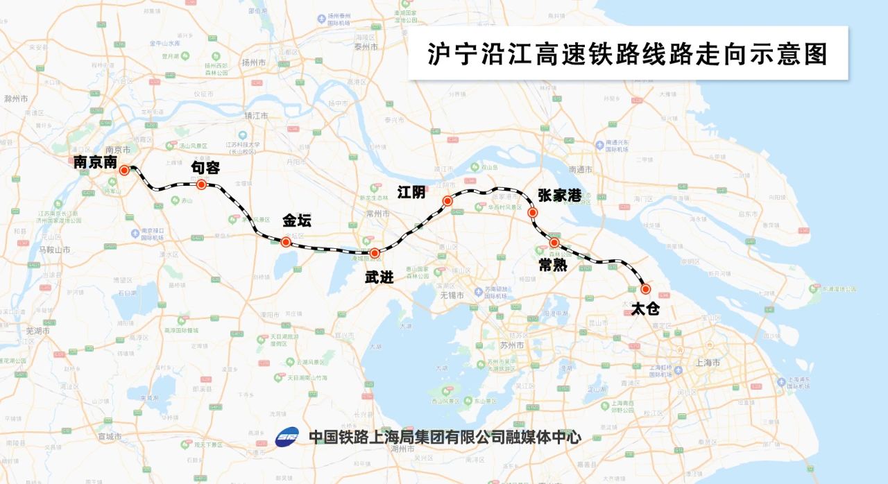 沪宁沿江高铁正线全长278.53公里,速度目标值350公里/小时,全线共设南京南、句容、金坛、武进、江阴、张家港、常熟、太仓8个车站,在太仓站经沪通铁路一期接入上海。