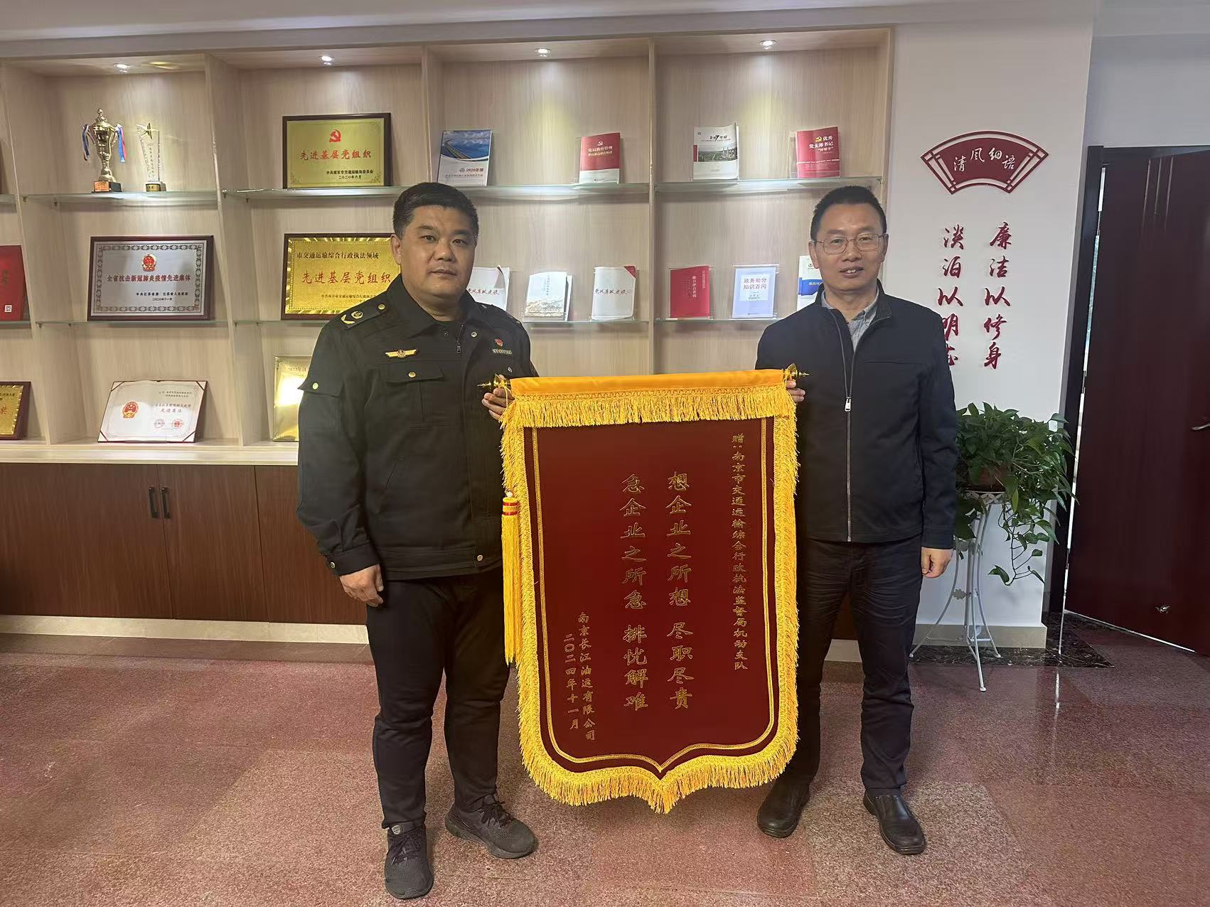 近日,南京长江油运有限公司向南京市交通运输局交通执法总队机动支队赠送了“想企业之所想尽职尽责,急企业之所急排忧解难”的锦旗。