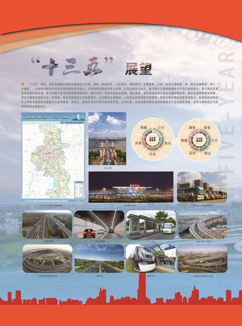“十三五”期间,南京交通将以建设交通强市为目标,围绕“枢纽都市、公交都市、畅达都市”发展愿景,打造“综合交通枢纽”和“综合运输服务”两个“升级版”,以加快构建现代综合交通运输体系为核心,以供给侧结构性改革为主线,以深化改革为动力,着力提升交通运输服务水平和行业竞争力,着力推进交通基础设施互联互通,着力构建行业可持续发展保障体系。到2020年,基本形成安全便捷、畅达高效、绿色智能的现代综合交通运输体系,综合交通网络更加完善,综合交通枢纽承载力进一步增强;综合运输服务水平显著提升,公交都市全面建成,人民群众的获得感不断增强;货运与现代物流业更具竞争力,区域性航运物流中心和航空速递物流集散中心全面建成;信息化、智能化有效引领行业转型升级;法治交通、安全发展和绿色发展深度融合于全过程各领域,改革与创新成为可持续发展的主要驱动力。