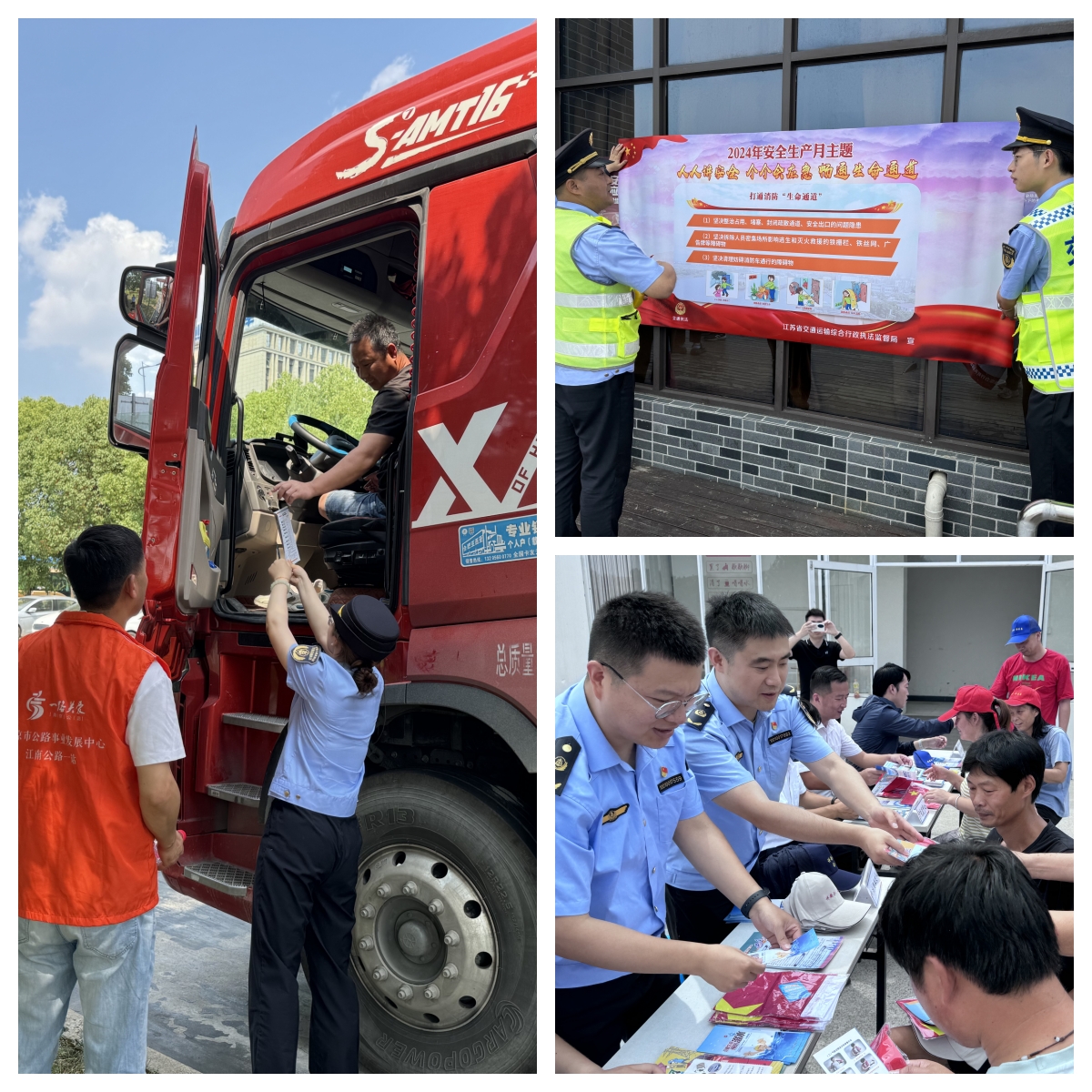 在栖霞山大桥服务区,执法局三支队联合南京公路发展集团、高速交警四大队、南京公交集团等单位,围绕路政管理规定、超限运输管理规定及安全生产条例等内容,通过张贴安全生产月海报、提供现场咨询及向客、货运驾驶员发放安全手册的方式,热情主动地讲解相关政策法规,将安全理念传达给广大驾乘人员。