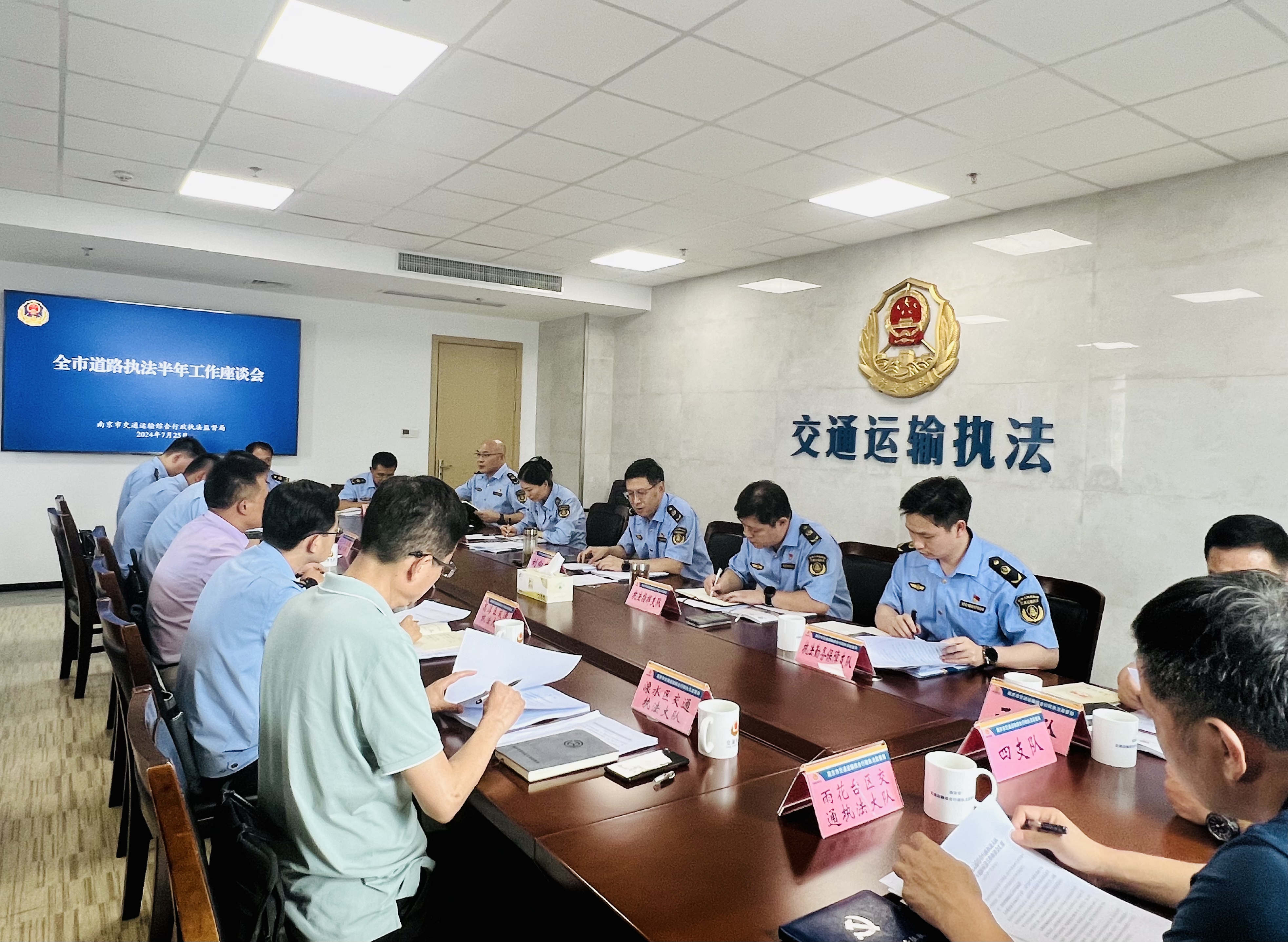 7月25日,南京市交通运输局综合执法局组织召开2024年上半年全市道路执法工作座谈会,全面总结上半年全市道路执法工作,确保下半年各项工作提质增效。市交通综合执法局局长刘向东、相关支队,各区交通综合执法机构负责同志参加会议。