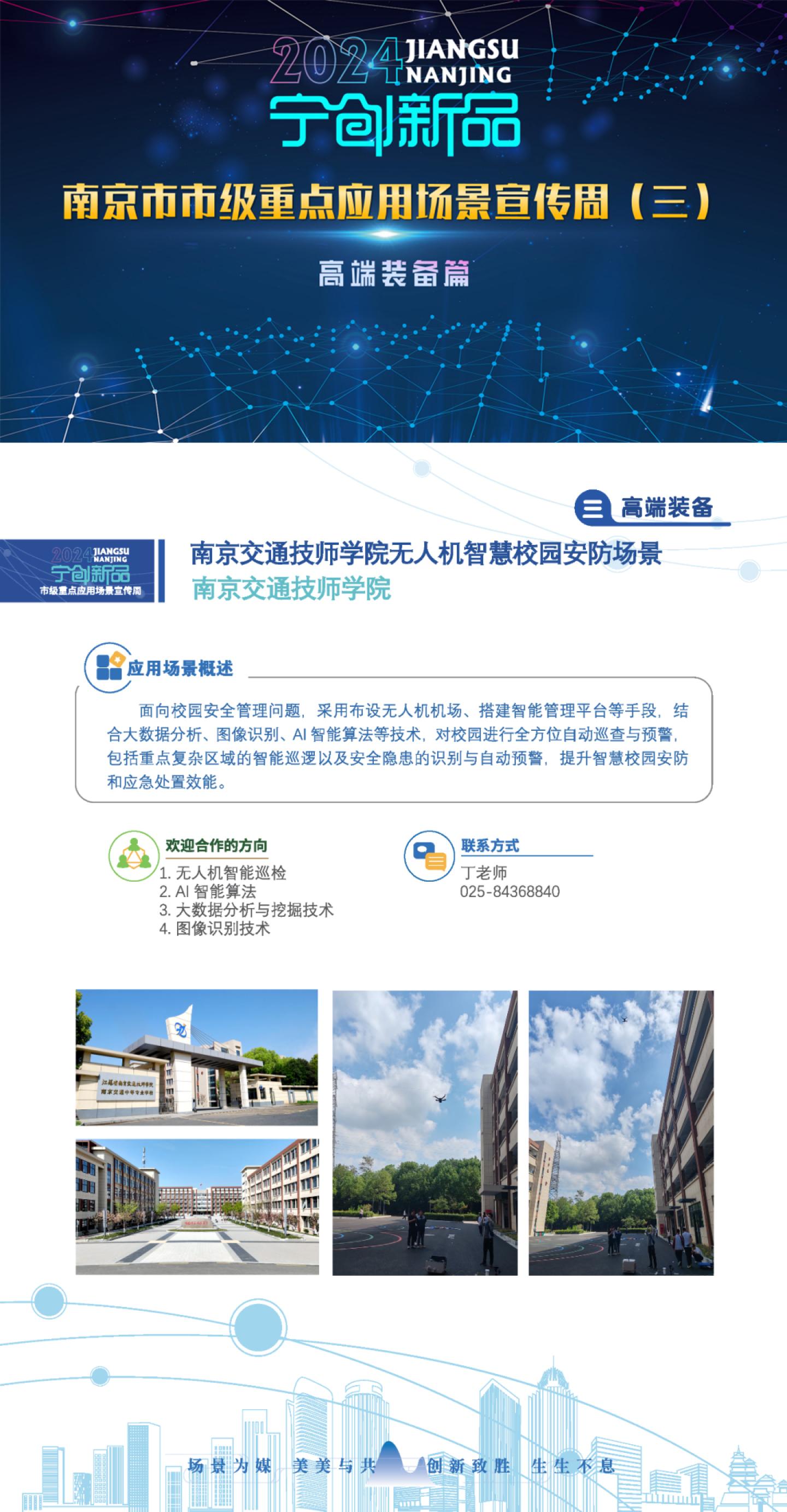 近日,南京交通技师学院无人机智慧校园安防场景凭借其出色的数字化技术和卓越的创新能力,成功获批入选2024年南京市市级重点应用场景,现正在南京市工信局应用场景发展处主办的“宁创新品——2024年南京市市级重点应用场景宣传周”上进行特色展示和宣传。