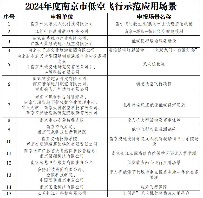 2024年底,南京市交通运输局会同南京市低空飞行服务中心向全社会公开征集2024年度低空飞行典型示范应用场景,秉持打造标杆、突出创新、强化引领的原则,共遴选出南京夫子庙文化旅游集团有限公司的“秦淮低空灯彩活动—‘鱼跃龙门·秦淮灯彩’”、江苏长江汇科技有限公司的“‘汇闪送’无人机智慧物流应用平台”、南京交通集团智慧飞行服务有限公司的“低空政务融合飞行应用场景”、南京市规划和自然资源局的“北斗时空底座赋能低空经济发展”等共15个低空示范应用场景(附后)。