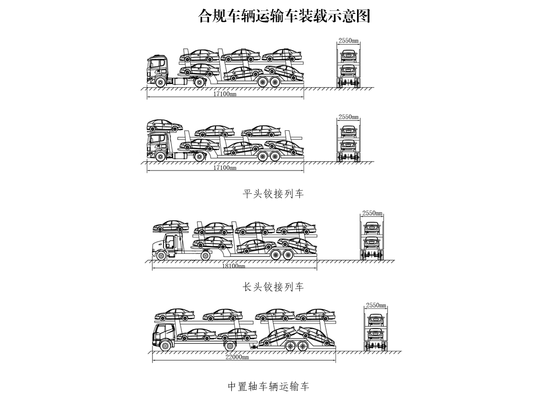 根据交通运输部《关于深入推进车辆运输车治理工作的通知》文件规定:平头铰接列车装载6辆及以下,长头铰接列车装载7辆及以下,中置轴车辆运输车装载8辆及以下,且装载长度、宽度不得超过车辆运输车外廓尺寸限值(见下图)。