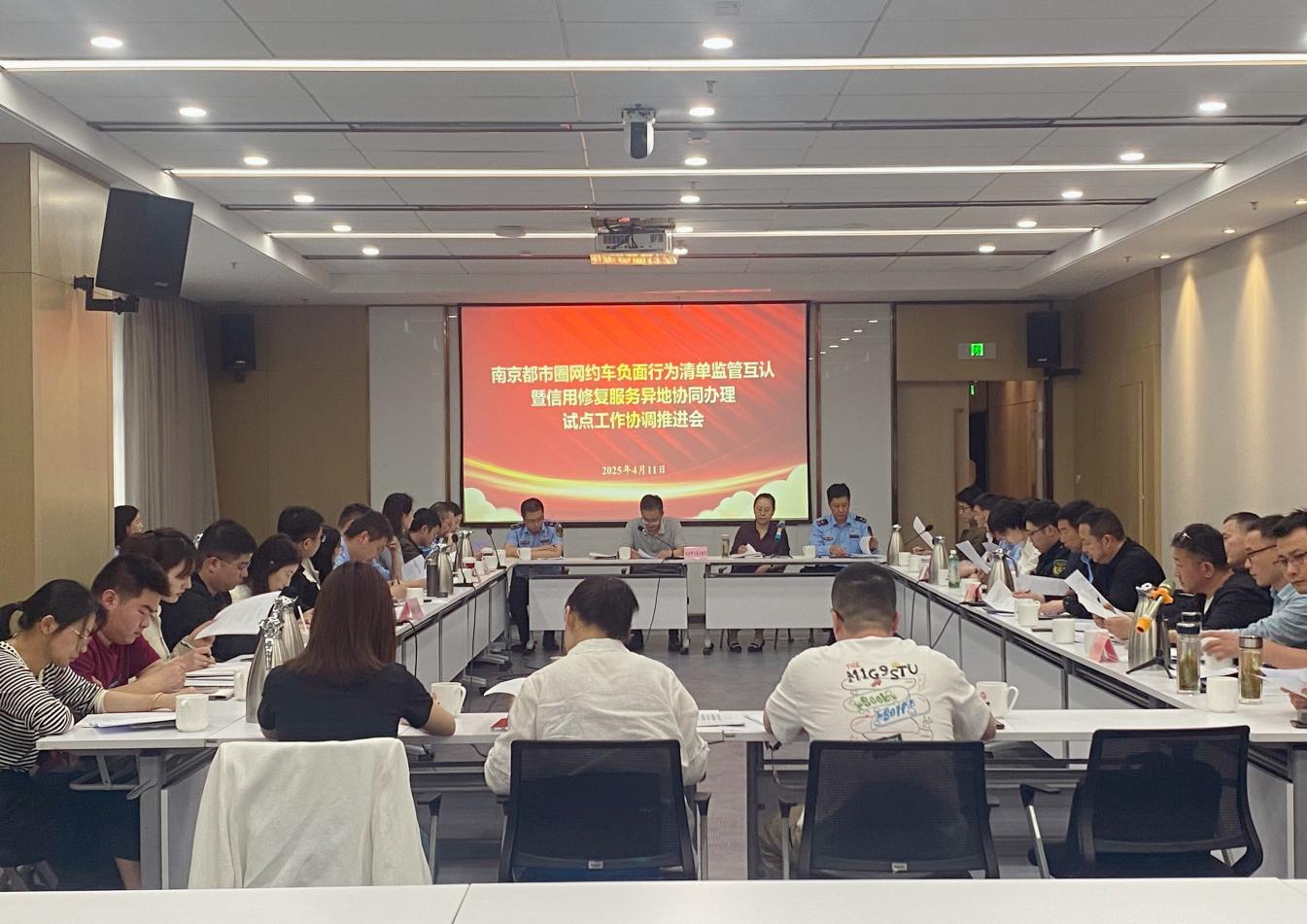 为推动落实《南京都市圈交通运输领域信用协同监管试点方案》中网约车监管和信用修复两项试点任务,强化南京都市圈网约车行业管理,提升跨区域信用修复办理效能,2025年4月11日,南京市交通运输局组织召开南京都市圈网约车负面行为清单监管互认暨信用修复服务异地协同办理试点工作协调推进会。南京、镇江、扬州、淮安、芜湖、马鞍山、滁州、宣城市交通运输局及常州市金坛区、溧阳市交通运输局信用工作牵头部门、两项试点任务具体责任部门的相关负责同志参会。