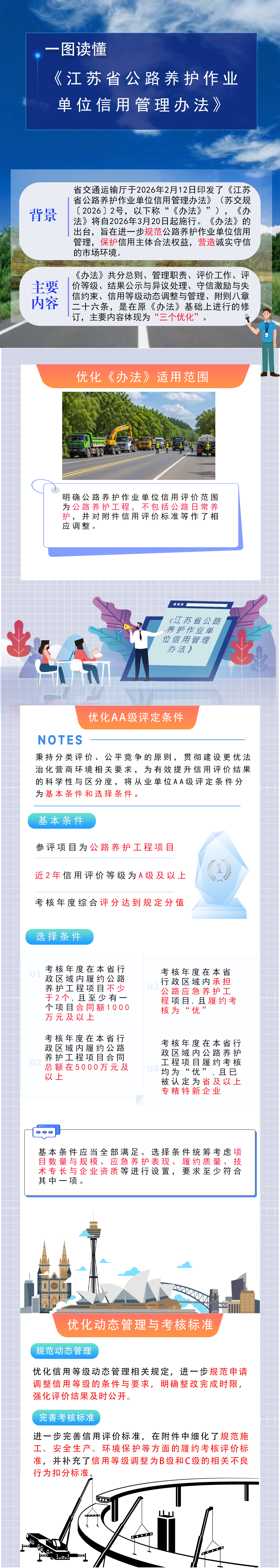 近日,省交通运输厅印发《江苏省公路养护作业单位信用管理办法》(以下称《办法》),对2023年颁布的试行管理办法进行了修订,将于2026年3月20日起施行。《办法》的颁布实施,旨在进一步规范公路养护作业单位信用管理,保护信用主体合法权益,营造诚实守信的市场环境。