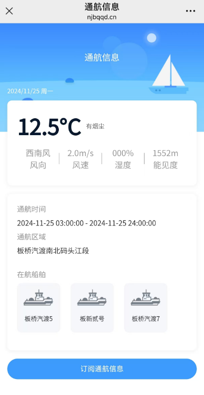 答:根据《江苏海事局 江苏省交通运输厅 关于实施“一渡一策”强化长江客汽渡重特大事故风险防控的通知》规定,板桥汽渡实行21小时渡运(凌晨0点至凌晨3点停航)。逢恶劣天气、重大活动时,可关注“南京市板桥汽渡服务中心”微信公众号,“通告”一栏实时获取停复航信息。