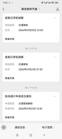 答:根据上级部门通知,经安全评估,板桥汽渡实行20小时渡运(每日0-4时停渡)。逢恶劣天气、重大活动时,可关注“南京板桥汽渡”微信服务号,即可及时接收船舶停复航提醒,“通航信息”一栏可实时查看停复航状态。