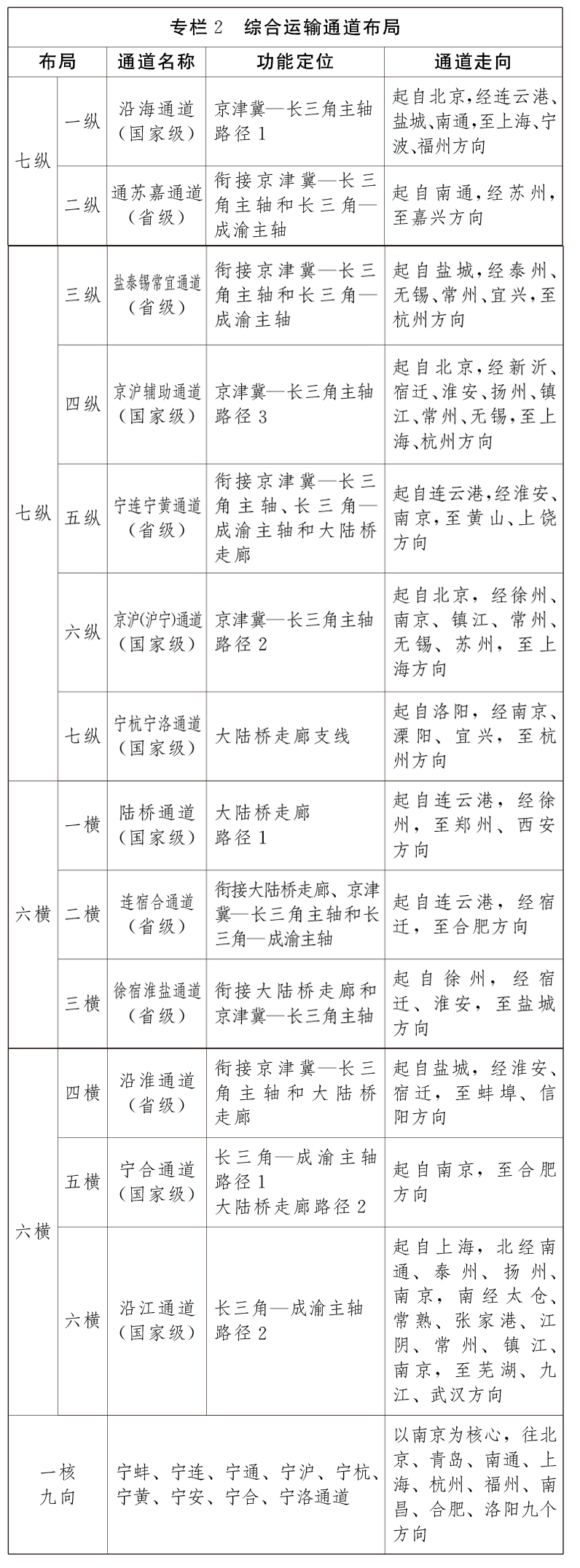 强化国家综合立体交通网主骨架中“京津冀—长三角主轴、长三角—成渝主轴、大陆桥走廊”在省域内的连通,加密省内运输通道,形成以南京为核心的“七纵六横,一核九向”综合运输通道布局。