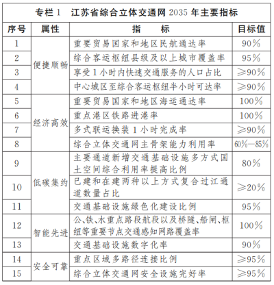 到2035年,基本建成便捷顺畅、经济高效、低碳集约、智能先进、安全可靠的现代化高质量综合立体交通网,具有世界级城市群特征的综合立体交通网络高效畅达,有力支撑“123出行交通圈”(1小时都市圈通勤、2小时畅行江苏、全国主要城市3小时覆盖)和“123快货物流圈”(国内1天送达、周边国家2天送达、全球主要城市3天送达)。交通基础设施质量、智能化与绿色化水平居世界前列。