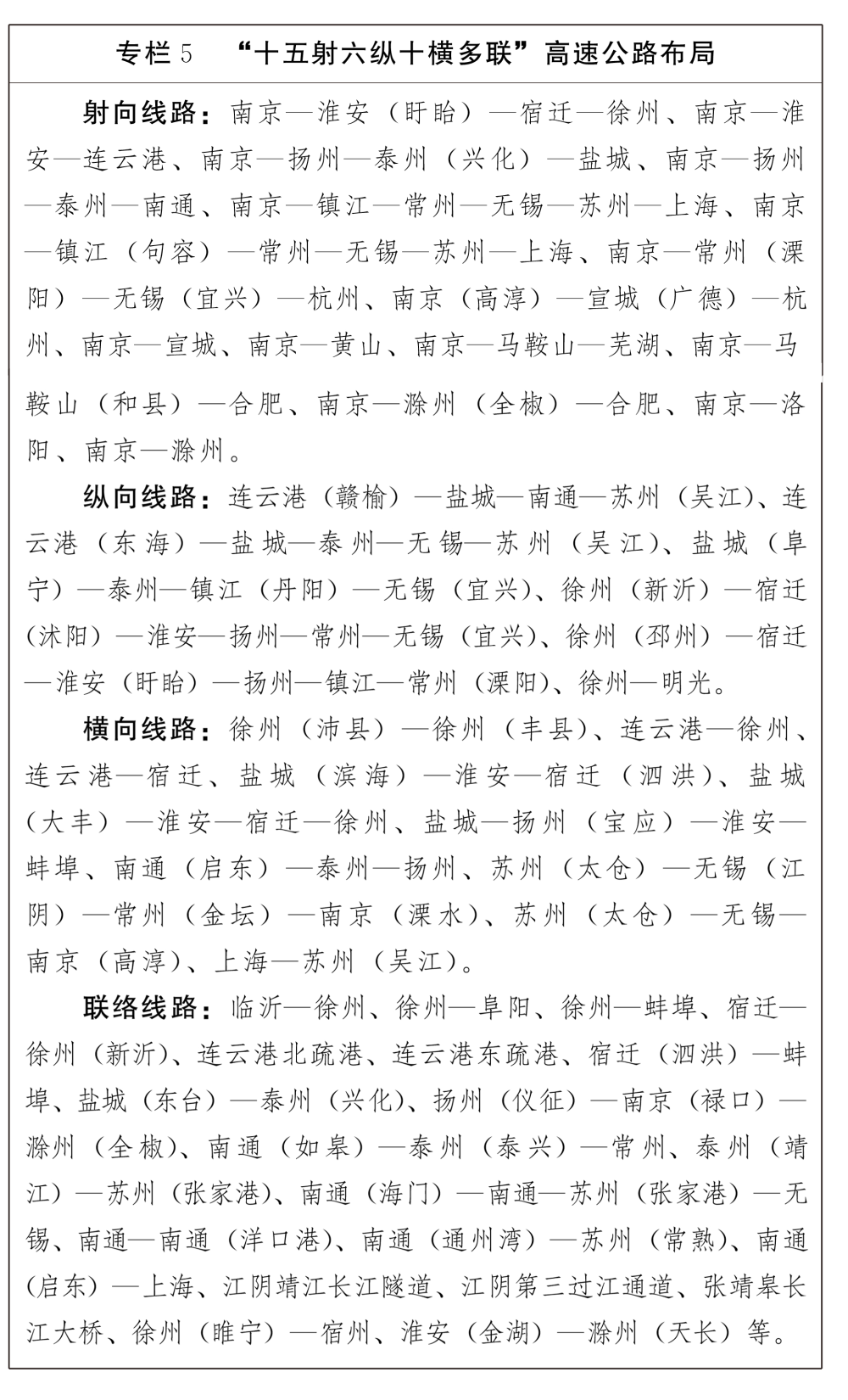 高速公路。支撑长三角世界级城市群交通一体化发展,增强南京长三角特大城市辐射带动功能,促进跨江南北融合,服务沿海地区高质量发展,强化省际通道衔接。以存量挖掘、新增优质增量和完善整体布局为重点,加快对繁忙通道的扩容改造。到2035年,规划形成“十五射六纵十横多联”的高速公路网络布局,总里程约7100公里。远景预控临海高速公路及城市环线、城市对外联系、过江通道连接线等高速公路。