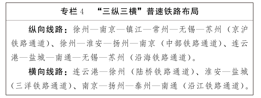 普速铁路。推进重要运输通道高普复合,打通京沪铁路通道南北向货运堵点,提升中部铁路通道货运能力,完善沿海铁路通道货运功能;发挥陆桥铁路通道货运能力,强化沿江铁路通道西向辐射功能,提升三洋铁路通道货运能力。切实提高沿江沿海主要港口后方集疏运水平,构建以沿江、沿海、陆桥为主的高效陆海联运格局,有力支撑沿江沿海产业转移。以资源富集区、主要港口及省级示范物流园区为重点,规划建设铁路专用线,畅通铁路运输“最后一公里”,形成干支有效衔接的现代铁路集疏运系统。到2035年,规划形成“三纵三横”普速铁路网,总里程2100公里。远景预控重要通道货运铁路。
