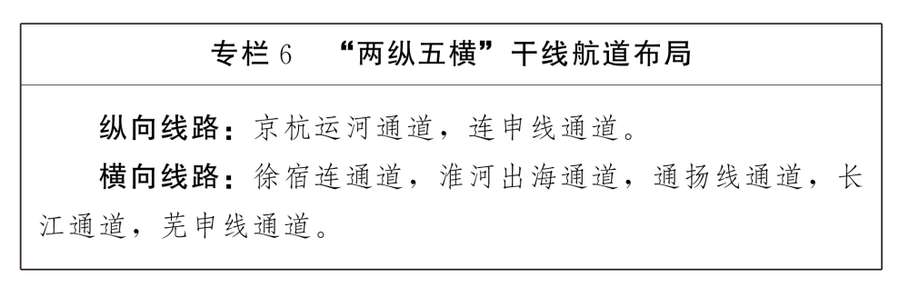 按照“强化通道、通海达港、注重衔接、提高覆盖”的原则,打通通航关键节点,提升县级节点覆盖,完善干线航道布局,构建以长江干线、京杭运河为主轴,三级及以上航道为骨干,通江、达海、联网、畅通的千吨级航道网。到2035年,“两纵五横”干线航道里程约4000公里。远景预控强化对县级节点覆盖的干线航道。