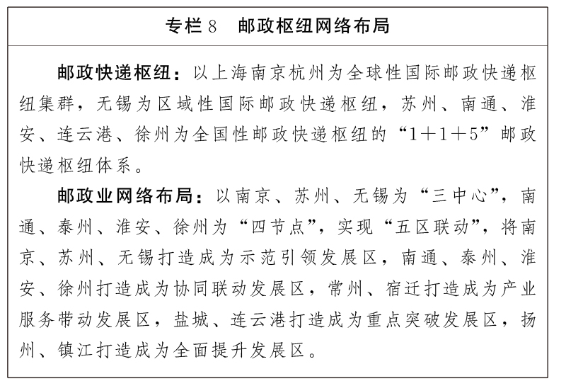 与邮政快递融合发展。建设邮政快递枢纽。推动实施邮政快递出海工程,南京禄口机场加快建设中国邮政国际货邮综合核心口岸,引入中邮航国际货邮业务;组织开展国际邮件专列等特色化班列服务。实施快递进厂、快递进村工程,新建或改造集客货运与邮政快递等功能于一体的物流服务站,鼓励多站合一。