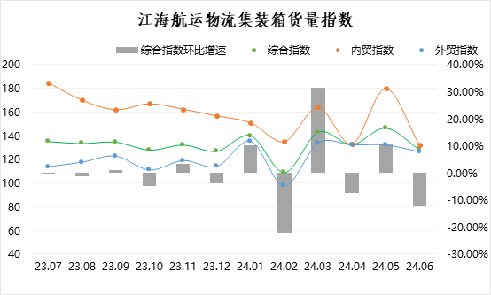 6月南京江海航运物流集装箱货量外贸指数持平,内贸指数下降