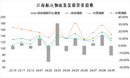 9月南京江海航运物流集装箱货量指数较上月显著下跌。集装箱货量综合指数131.7点,环比下跌13.41%,同比下跌2.17%。