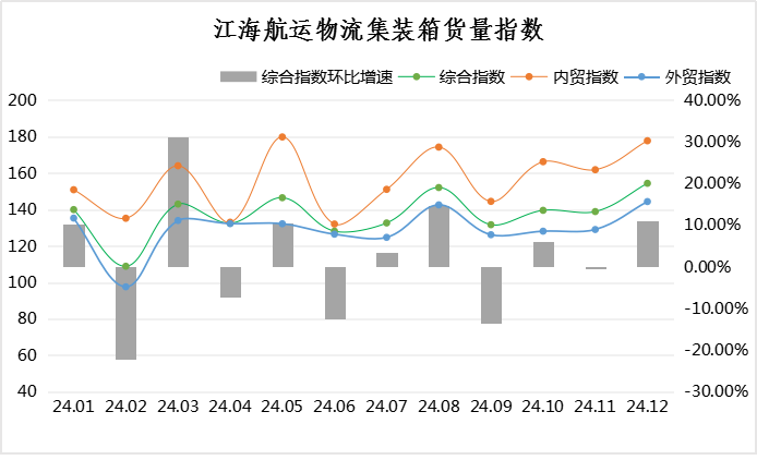 外贸方面,各航司有意在年后上调价格,叠加节前出货高峰,货主出货意愿高,外贸集装箱箱量较上月大幅增长。12月集装箱货量外贸指数144.4点,环比上涨11.89%,同比上涨26.53%。(南京市交通运输发展中心)